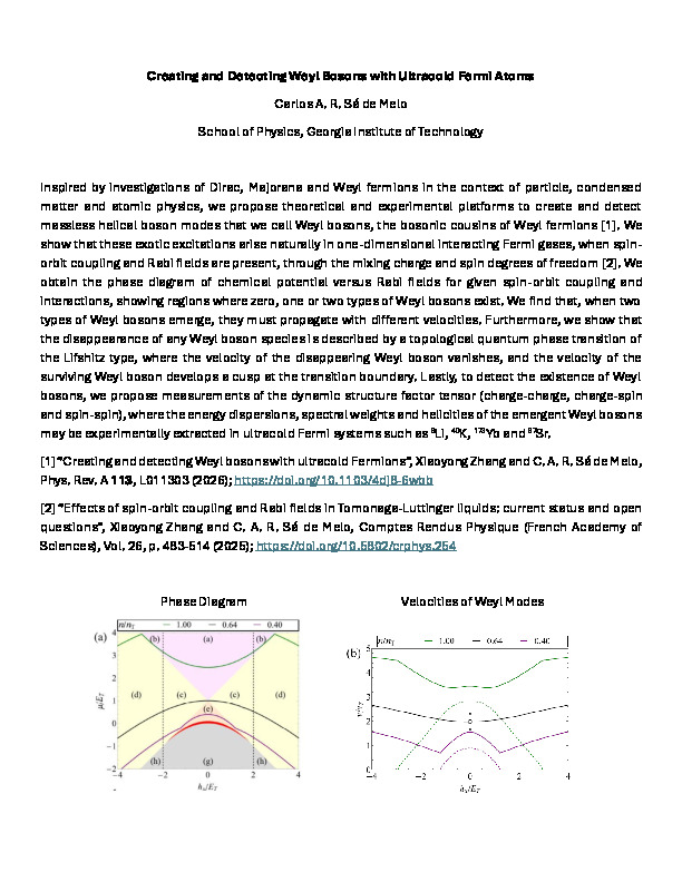 Inspired by investigations of Dirac, Majorana and Weyl fermions in the context of particle, condensed matter and atomic physics, we propose theoretical and experimental platforms to create and detect massless helical boson modes that we call Weyl bosons, the bosonic cousins of Weyl fermions [1]. We show that these exotic excitations arise naturally in one-dimensional interacting Fermi gases, when spinorbit coupling and Rabi fields are present, through the mixing charge and spin degrees of freedom [2]. We obtain the phase diagram of chemical potential versus Rabi fields for given spin-orbit coupling and interactions, showing regions where zero, one or two types of Weyl bosons exist. We find that, when two types of Weyl bosons emerge, they must propagate with different velocities. Furthermore, we show that the disappearance of any Weyl boson species is described by a topological quantum phase transition of the Lifshitz type, where the velocity of the disappearing Weyl boson vanishes, and the velocity of the surviving Weyl boson develops a cusp at the transition boundary. Lastly, to detect the existence of Weyl bosons, we propose measurements of the dynamic structure factor tensor (charge-charge, charge-spin and spin-spin), where the energy dispersions, spectral weights and helicities of the emergent Weyl bosons may be experimentally extracted in ultracold Fermi systems such as 6Li, 40K, 173Yb and 87Sr. [1] “Creating and detecting Weyl bosons with ultracold Fermions”, Xiaoyong Zhang and C. A. R. Sá de Melo, Phys. Rev. A 113, L011303 (2026); https://doi.org/10.1103/4dj8-6wbb [2] “Effects of spin-orbit coupling and Rabi fields in Tomonaga-Luttinger liquids: current status and open questions”, Xiaoyong Zhang and C. A. R. Sá de Melo, Comptes Rendus Physique (French Academy of Sciences), Vol. 26, p. 483-514 (2025); https://doi.org/10.5802/crphys.254 |